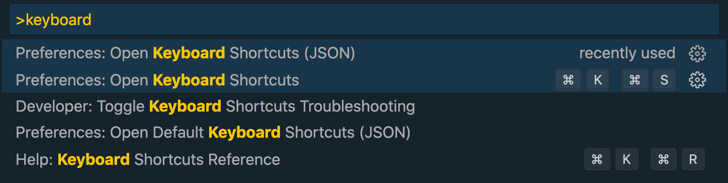 더 많은 기본 단축키는 이렇게 cmd+k+s를 눌러 cursor로 검색하면 확인 가능하다.
