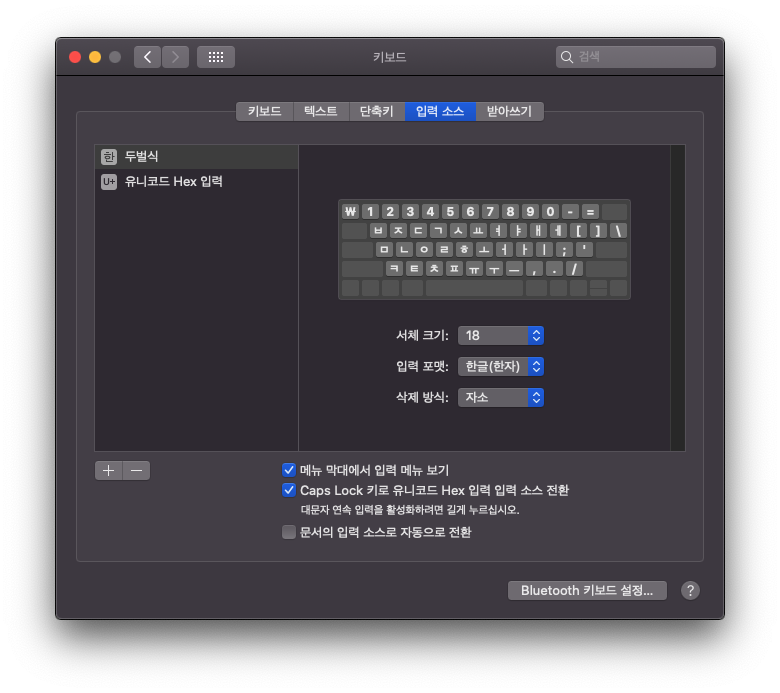 해결 방법은 시스템 환경설정-키보드-입력 소스에 가서 왼쪽 하단의 + 버튼을 누르고 유니코드 Hex 입력 을 추가해주는 것이다. (원래 있던 abc는 삭제한다.)